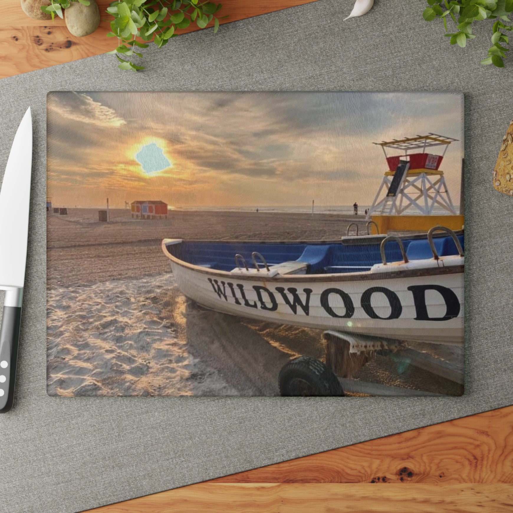 Wildwood NJ Beach Scene Glass Cutting Board, Coastal Kitchen Décor 11X15, Nautical Cutting Board, Jersey Shore